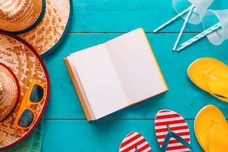 Reading on summer vacation holiday, book with blank mock up pages on blue wooden boards with beach accessories, flat lay top view