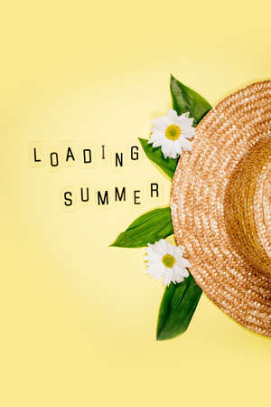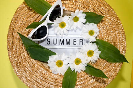 Womens summer straw hat on yellow background top view flat lay copy space. Summer travel vacation concept, single item. Text SUMMER from letters and field chamomiles flowers on yellow.