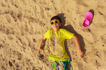 Active time on holidays concept. Young little boy having fun with sand on seaside beach. Kid child spending time on fresh summer air.