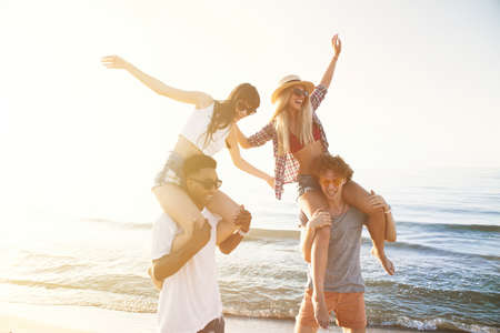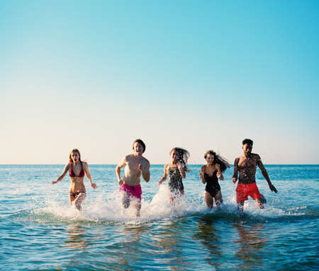 Happy friends have fun on the beach - Young people playing in open air water on summer holidays.