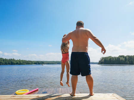 Caucasian family father and daughter standing on wooden lake river dock having fun together. Dad holding lifting up his child girl. Happy childhood and summer activity. View from back.