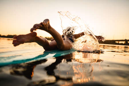 rear view of woman lying on wakeboard rowing and splashing water with her hands