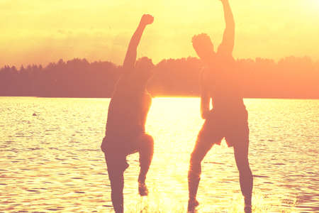 Two happy multiracial couple jumping together on the sea water with arms up to the sky smiling in vacation at tropical ocean resort. Tattoed handsome guy enjoys success celebrating with best friends