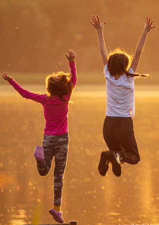 Carefree young friends people jumping outdoor on sky background. Happy women and man having fun. Summer happiness and freedom.