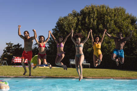 Diverse group of friends having fun and jumping into water at a pool party. Hanging out and relaxing outdoors in summer.