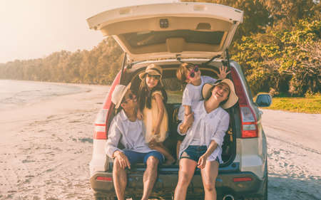 Happy asian family at consisting father, mother, son and daughter having fun in summer vacation on the beach with sitting on hatchback car. Family summer and holiday travel concept.
