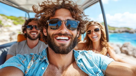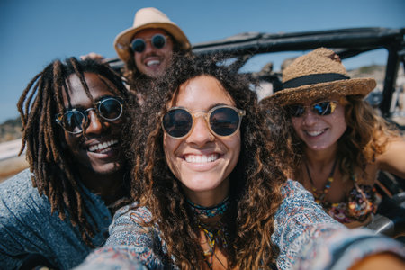 Diverse group of friends is taking a selfie in a convertible under the sun, showcasing their happiness and connection in a lively outdoor setting