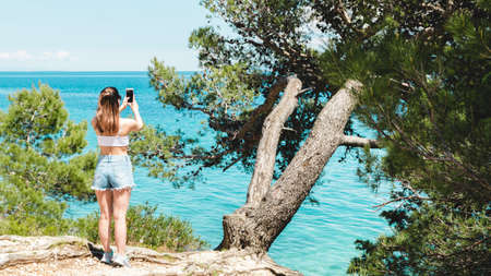 young woman traveler in sunglasses taking photo of sea scenery in mid day. blue sea and pine trees in croatia.