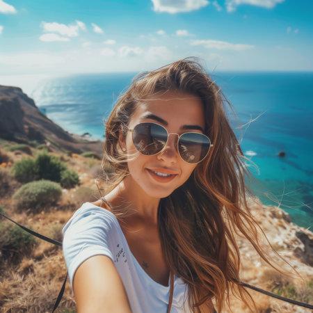 Girl on Cliff Selfie, Panoramic Sea View, Taking Pictures in Picturesque Places, Woman Tourist on Vacation, Photos for Memory, Girl in Sunglasses with Camera, Generative AI Illustration