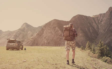 Smiling traveler enjoying scenic mountain view from car on sunny day. Adventure and road trip concept