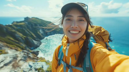 Happy Asian hiker woman taking selfie portrait on the top of mountain