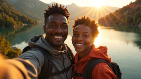 Smiling couple taking selfie during sunset hike near a peaceful lake, surrounded by hills and lush nature. Travel, adventure, romance, and outdoor activities for man and woman.