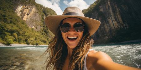 happy smiling male tourist in sunglasses and hat taking selfie in nature by the lake, made with Generative AI