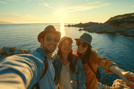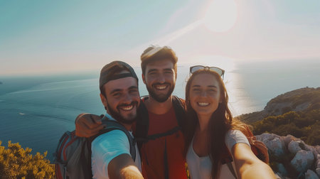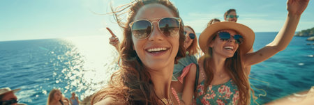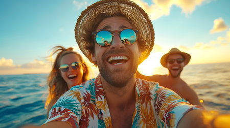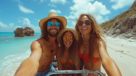 Friends taking a selfie on a tropical beach. Summer vacation and travel concept. Design for social media, travel blog, and holiday banner