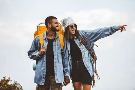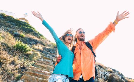 Happy boyfriend and girlfriend in love having genuine fun at travel excursion - Wanderlust life style and vacation concept with tourist couple at world trip on bright vivid filter