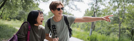 man in sunglasses pointing with finger near cheerful asian woman, banner