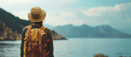 Young woman in hat with backpack, back view, summer travel concept, sea and mountain background