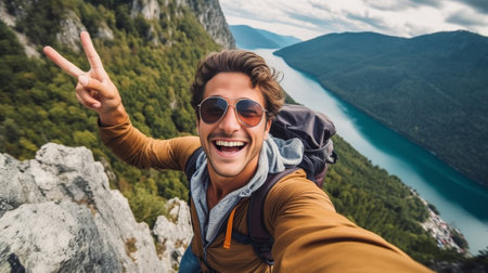 Generative AI : Crazy handsome man taking a selfie on a scenic landscape