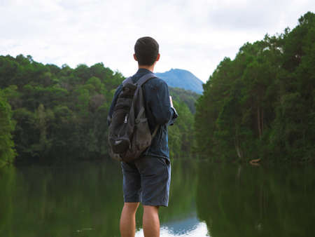 Young man backpack standing front of lake and valley background in natural,Traveler man look at mountain and lake