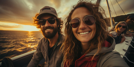 Group of friends taking a selfie on the beach at sunset or sunrise