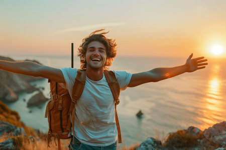 Caucasian man carrying backpack and outstretched arms at cliff at sunrise.