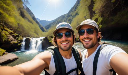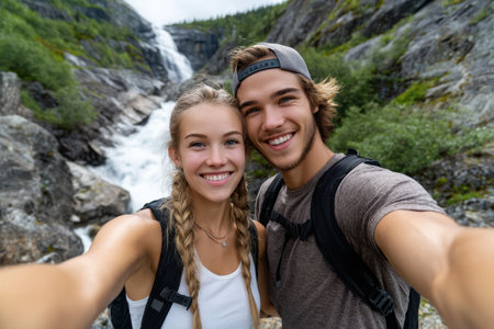 A young couple is taking a selfie in front of a stunning waterfall during their hiking trip in nature.
