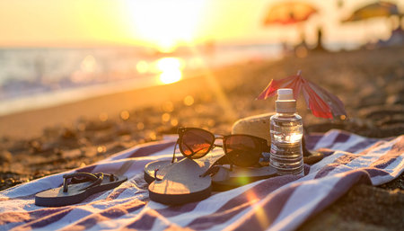Beach accessories on a towel with sunglasses flip flops and sunscreen at sunset Clear details and vibrant col...