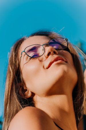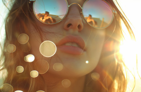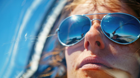A woman lounges comfortably on a deck chair, wearing fashionable sunglasses and a sun hat. She enjoys the bright and warm atmosphere.