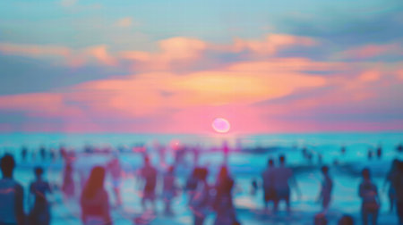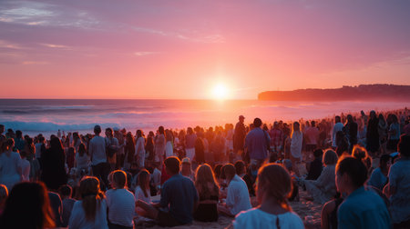 Sunset gathering at the beach with crowds enjoying the vibrant twilight atmosphere