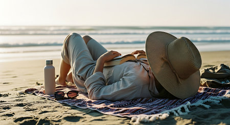 On the sandy beach rests a hat, sunglasses, a book, and a water bottle. The liquid inside glistens under the sun, creating a scene of leisure and relaxation AIG50