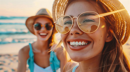Smiling women leaning into each other on sandy ocean shoreline, with swimsuits and sunglasses. Sunset, camaraderie, leisure, relaxation, coastal, warmth, friendship