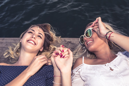 Friends having fun outdoors. Two beautiful girls lying next to the river and looking at each other. Laughing while enjoying the evening by the water. Lifestyle.Look from above