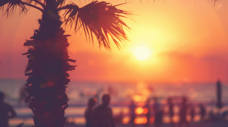 A scenic view presents silhouetted palm trees set against a vibrant sunset sky. The composition features a bokeh effect, suggesting a party or celebration atmosphere. The color palette includes warm orange hues and cooler blue tones. This visual could be used for travel advertising, editorial content, or creative projects. It offers a sense of relaxation and leisure.