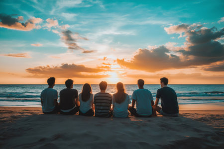 Group of friends sitting together on the beach, enjoying a stunning sunset over the sea, embracing the peaceful evening atmosphere