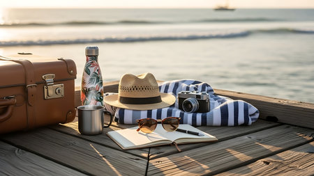 Traveler's essentials on a wooden pier overlooking the ocean at sunset