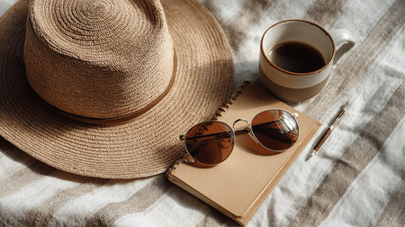 straw hat, sunglasses, beach, summer, vacation, relaxation, laid back, serenity, sunbathing, coastal lifestyle, warm tones, peaceful setting, ocean view A straw hat with dark sunglasses rests on a p