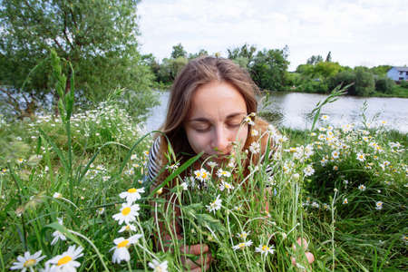 Beautiful young woman with brown hait, smiling, in chamomile field