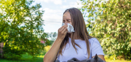 Woman holding a cat. Woman is allergic to cats. Allergy to cat fur
