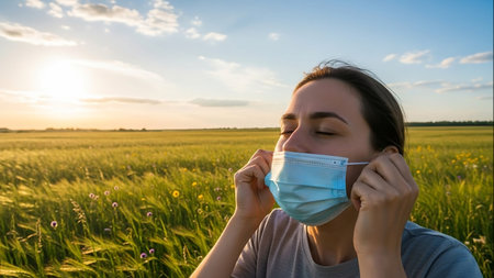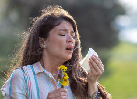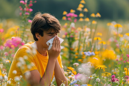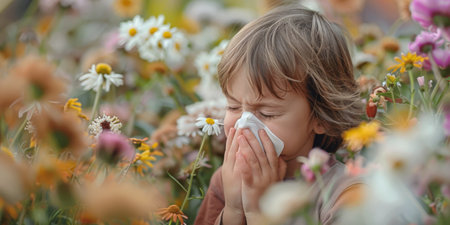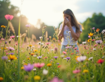 suffering from seasonal allergies in a blooming meadow filled with an abundance of wildflowers and tall grasses. High quality photo