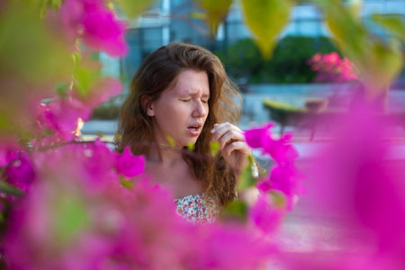 The girl blows her nose, the girl is allergic to flowering, spring. Girl sneezes into a napkin, culture, runny nose, spring, flowers.