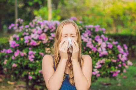 Portrait of beautiful young allergic woman is suffering from pollen allergy or cold on natural flower flowering tree background at spring or sunny summer day sneezes, blowing her runny nose rubs eyes