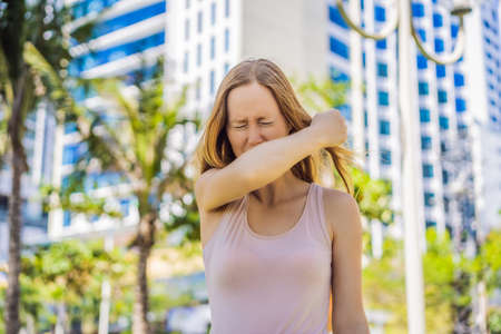 Young beautiful woman with seasonal illness sneezing because of pollen.
