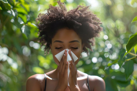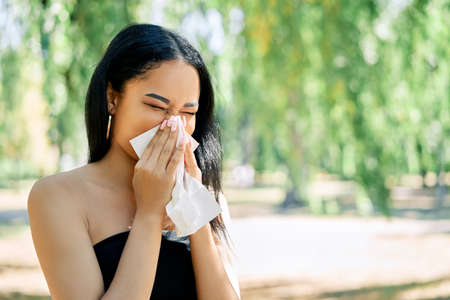 African American woman in park using a tissue to manage allergy symptoms on a sunny day.