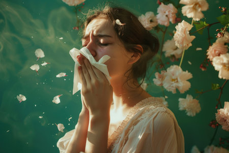 girl sneezing into handkerchief, on a green background, flying flowers around, concept spring, allergy