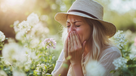 A young woman wearing a summer hat sneezes into a tissue as she stands among blooming flowers in a garden, capturing a moment of natural beauty and serenity.
