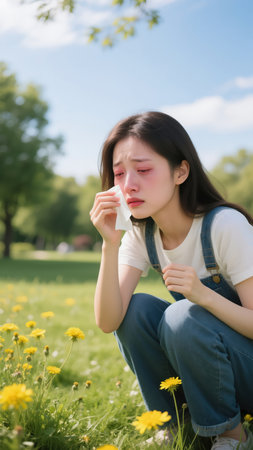 A woman is blowing her nose in a field of flowers. The scene is bright and cheerful, with the sun shining down on the flowers and the woman. The woman's face is focused on her task