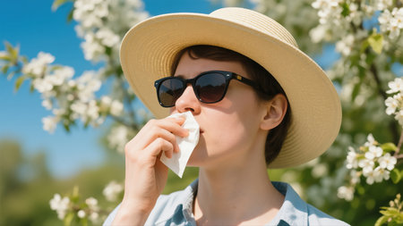 Young woman in hat and sunglasses sneezes in a napkin in the blooming garden.