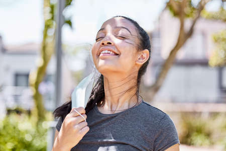 Feels good to fill my lungs with fresh air. a young woman taking off her face mask after going for a run outdoors.
