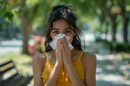 A woman with dark hair in a yellow top sneezing into a tissue while standing in a sunlit park.