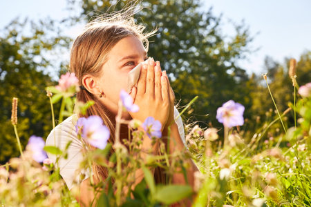 Girl with hay fever or flu blows her nose in the flowering meadow